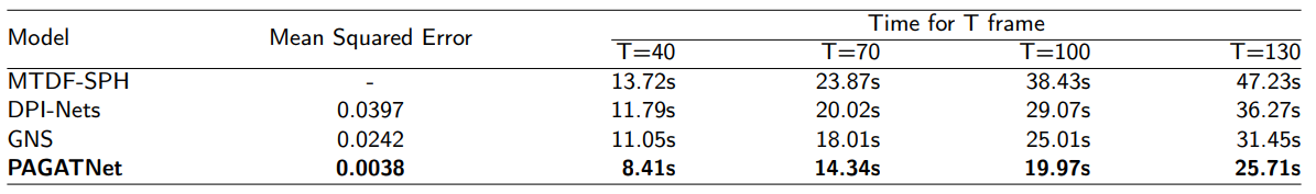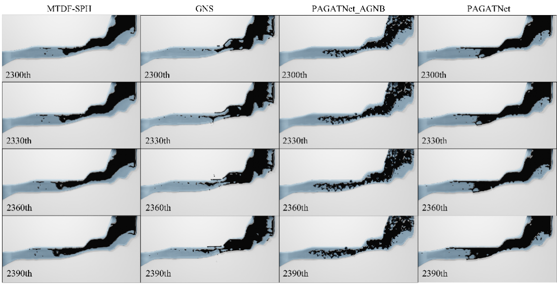 為了驗證模擬算法的效率,我們比較了MTDF-SPH、DPI-Nets、GNS和PAGATNet在真實河流上模擬原油泄漏的情況。如表2所示,與其它算法相比,PAGATNet顯著減少了整體計算時間。當模擬幀數為130時,PAGATNet所需的時間比MTDF-SPH少了45.57%。這表明,相較于其他算法,PAGATNet在模擬計算中具有更高的效率。