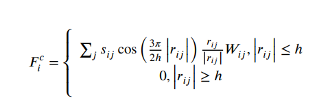 其中,是粒子間相互作用力的強度因子,rij是粒子i和j之間的距離,h是粒子的SPH核半徑。粒子的運動方程為: