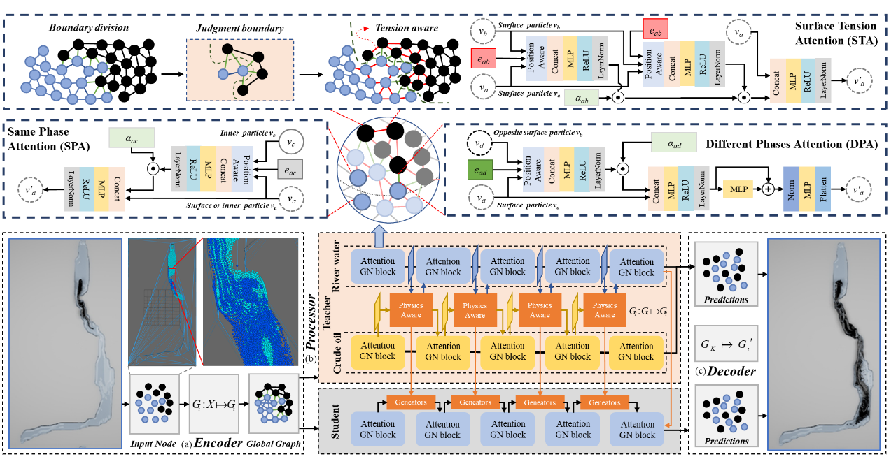 首先,本文提出了一種河流溢油擴散模擬方法MTDF-SPH,使原油泄漏擴散過程滿足不混溶多相流擴散物理規律。其次,為了提高模擬速度,設計了一種基于異構圖注意力機制的物理感知網絡PAGAT,該網絡使用MTDF-SPH方法生成的數據集進行訓練,并使用知識蒸餾方法對該網絡進行壓縮和優化,在保證模擬精度的同時加快模擬速度。最后,針對不同工況進行準確性和魯棒性實驗并得到了很好的模擬效果。
