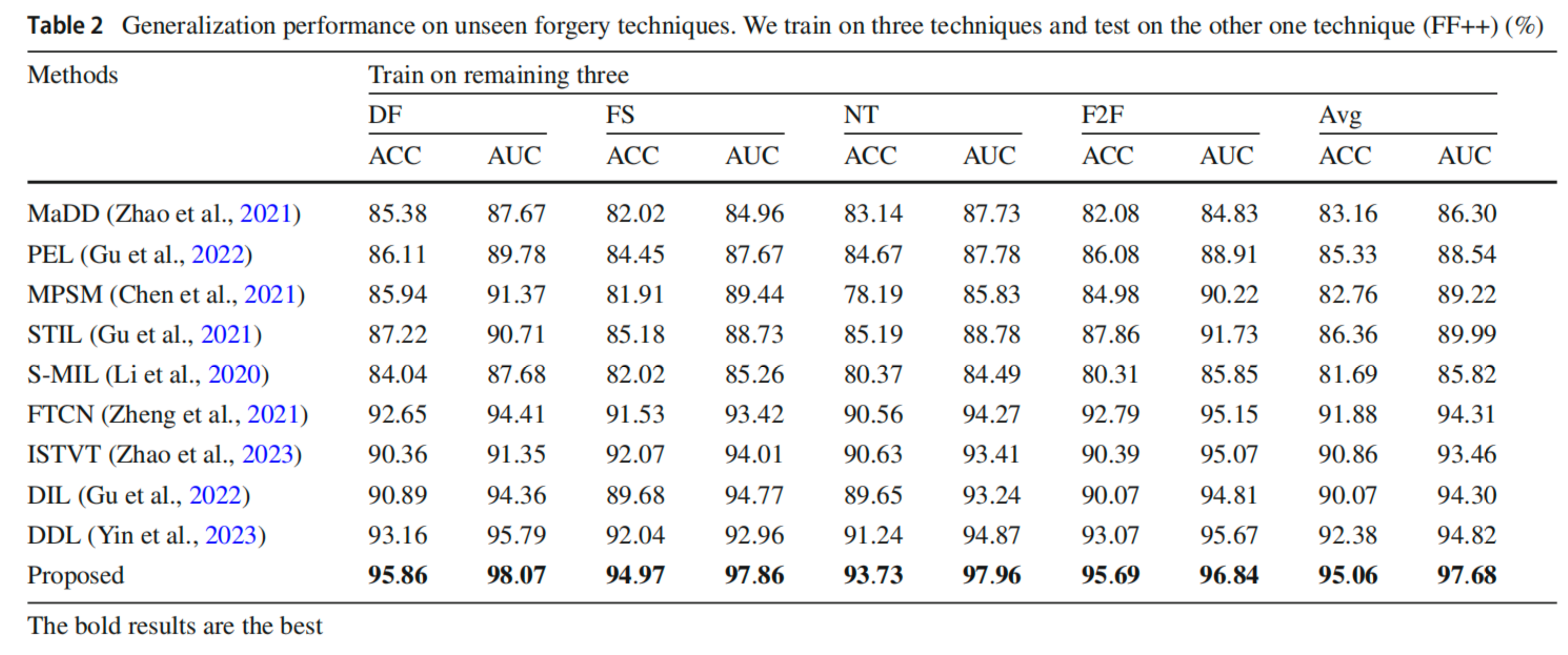 我們進一步評估所提算法在檢測未知偽造技術檢測方面的泛化能力。在此檢測任務中,在FF++數據集中使用留一法策略進行實驗,檢測準確率可以達到93%以上,如下圖。