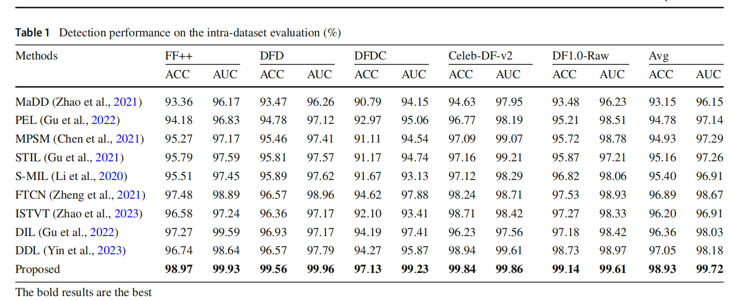 我們準備了6個偽造人臉視頻數據集,對于單數據庫內的檢測,我們的方法基本可以達到97%以上的準確率,如下圖。