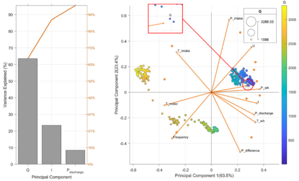 應用主成分分析方法,分析了該井發(fā)生故障前后數據之間的關聯(lián)性。在圖3中,第一主成分井口的產液量,貢獻率為63.5%,分析結果與物理認識相符,電潛泵井在運行過程中,井口產液量最能反應泵的健康狀態(tài),電泵在亞健康狀態(tài)和故障狀態(tài)下,產液量根據不同的故障類型會隨之下降;第二主成分為電流,通過監(jiān)測電潛泵的電流信號,從而判斷是否存在故障,例如,如果電流出現明顯的畸變或電流峰值異常高或低,可能表示電潛泵存在故障,如電機繞組短路、軸承損壞等;第三主成分為出入口壓差,出入口壓差是直觀反應電潛泵運行狀態(tài)和性能的重要指標。