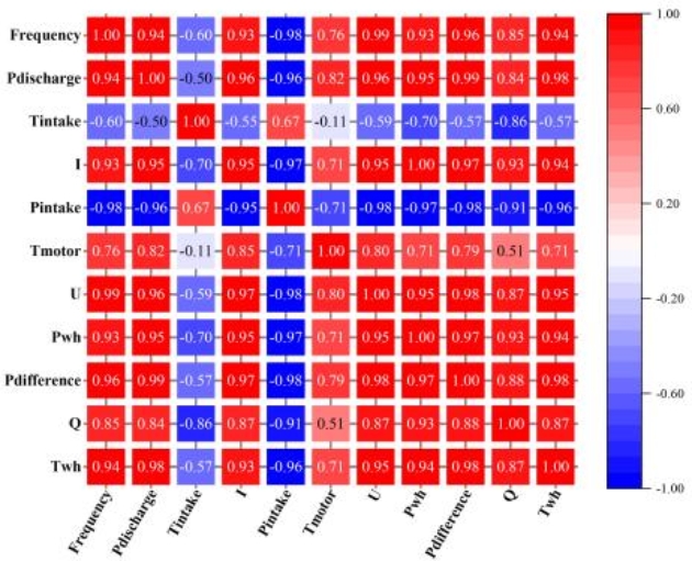 利用皮爾遜相關性分析分析 A01井電泵監(jiān)測系統(tǒng)可監(jiān)測參數兩兩之間的關聯(lián)程度,在圖2中,參數兩兩之間都有很強的相關性。