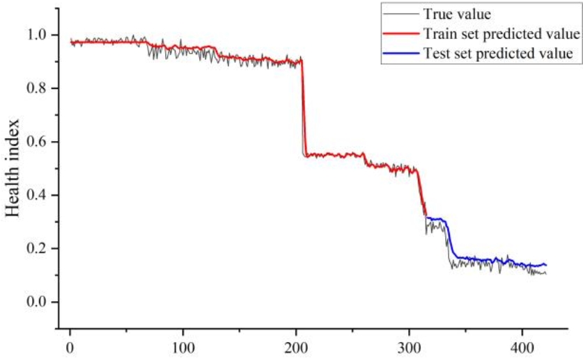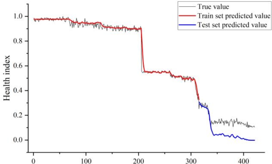 模型表現結果如圖8和圖9所示,圖中黑線為真實值,紅線為訓練集預測值,藍線為測試集預測值。圖8中,盡管LSTM在訓練集上表現出較好的擬合效果,但是在其測試集中,模型預測出了健康指數變化趨勢,但是由于在訓練集中缺少故障樣本,因此模型預測的健康指數偏低,與真實值不符。從圖9可以看出,在PC-LSTM的訓練集中,無論實在測試集還是驗證集中,模型都準確的預測了健康指數的變化趨勢,相較與LSTM模型,PC-LSTM在測試集中,健康指數預測結果更接近真實值。