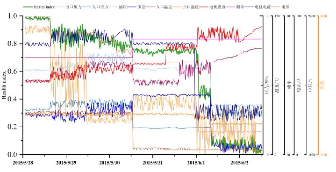 計算了A01H井故障前后時間段的健康指數(圖5中綠色線條),該井在生產過程中,由于產出液中含有雜質、出砂等原因,造成了泵葉輪或吸入口發(fā)生堵塞。