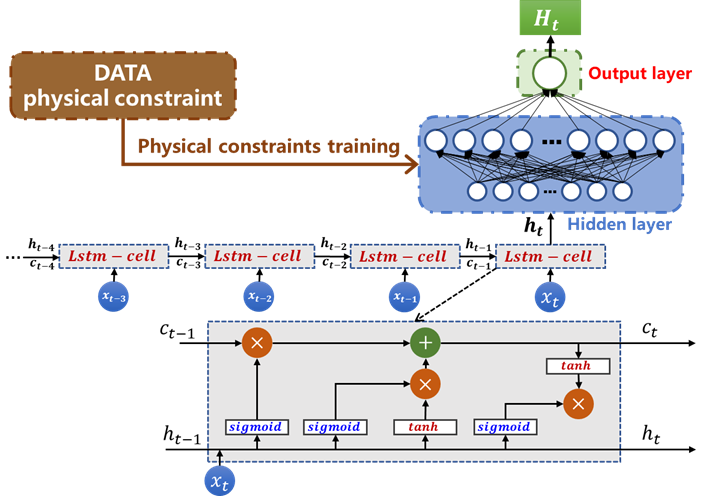 物理約束的LSTM網絡結構如圖2所示,DATA為模型輸入數據,LSTM其損失函數表達式為Lossdata;PDF為井筒能量守恒控制方程,其損失函數表達式為Losspdf。因此,物理約束的LSTM損失函數表達式為: