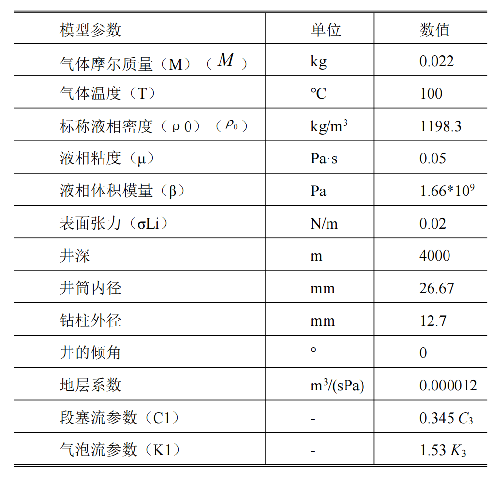 基于Fjelde等人提供的模擬數據,設立一個井深為4000米,內徑為26.67mm,外徑為12.4mm,鉆井液為水的井筒模型,以井口回壓為操縱變量,對簡化兩相流模型設計非線性模型預測控制器。具體參數如下表: