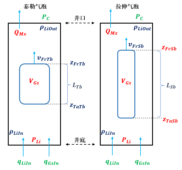 為模擬侵入井筒內氣體的運動,將整個井筒看作一個固定邊界的控制體積(Control Volume, CV),且CV中僅包含一個氣泡,氣泡的描述采用“雙形”氣泡表示方法。