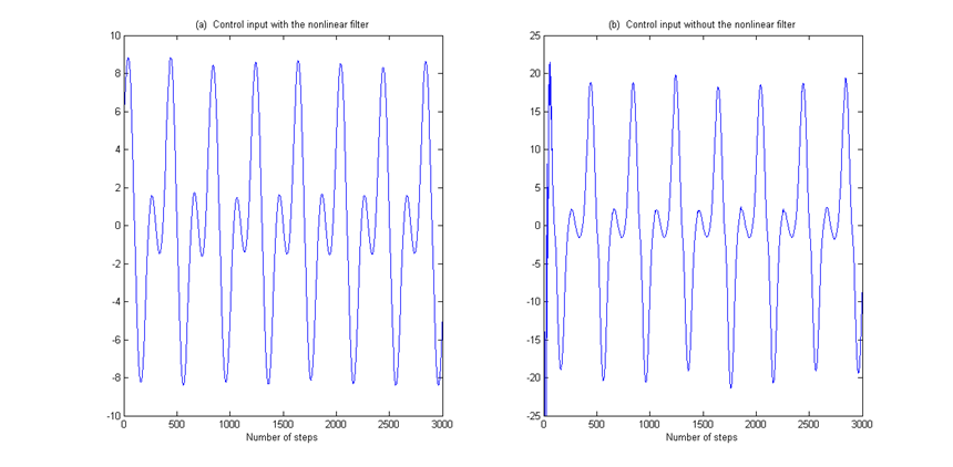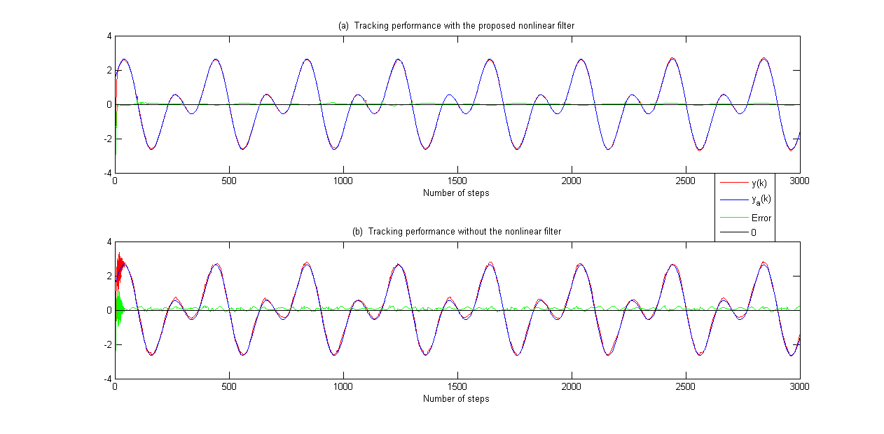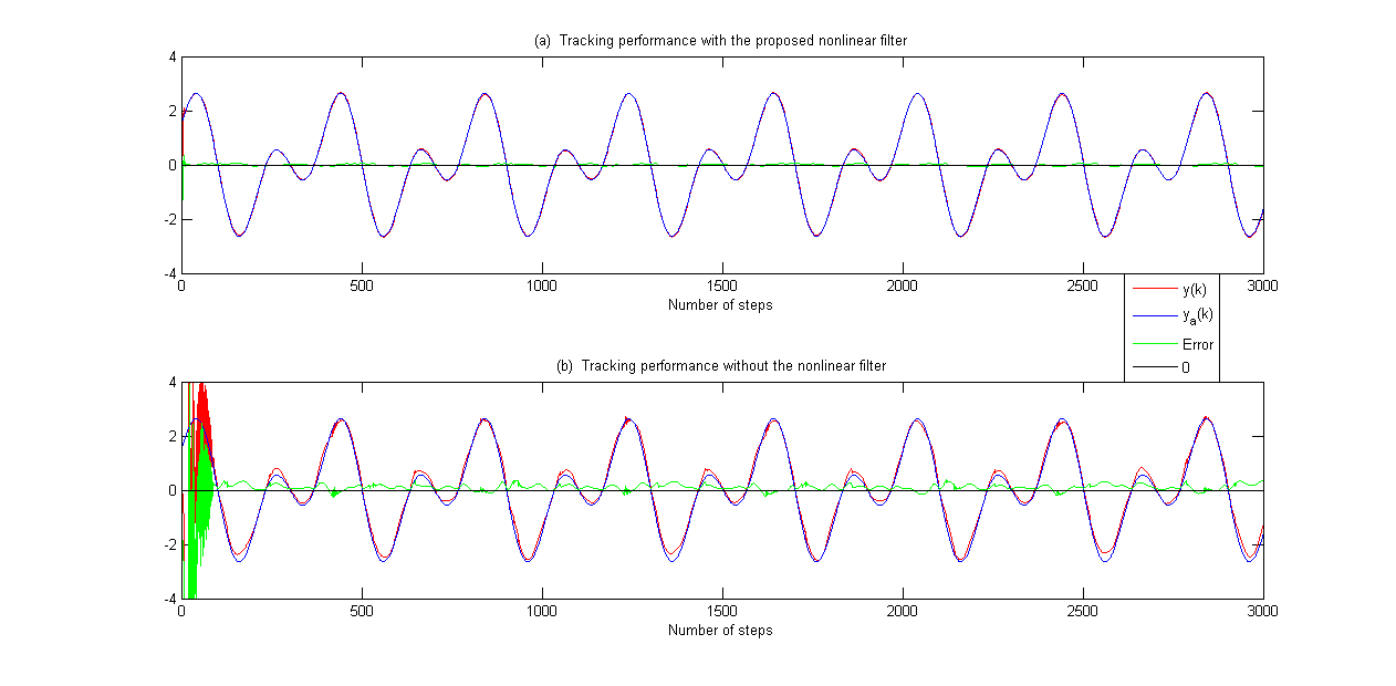 本文提出了一種新的基于非線性濾波器的自適應控制方法,并將其引入到一類具有輸入和輸出噪聲的非線性離散系統中。該方法結合了輸入前饋和輸出反饋。為了解決確定參數估計更新方向的問題,利用離散努斯鮑姆增益,以及擴展的自適應調諧序列來加快更新的過程。該方法同樣適用于無噪聲系統,并證明了無噪聲系統的收斂性。在存在輸入和輸出噪聲干擾的情況下,受卡爾曼濾波方程的啟發,將時間更新和測量更新方程推廣到非線性濾波器中,并證明了算法的收斂性。與一般不加濾波的自適應控制方法相比,該方法在識別過程中隨參數模型的變化呈現自適應的控制率變化。它提供了更好的參數軌跡跟蹤和實時性。相比之下,傳統的辨識方法保持固定的控制率,不隨估計參數的變化而變化。基于非線性濾波器的自適應控制提供了更精確的濾波輸出和更好的參考軌跡跟蹤。仿真結果驗證了理論結果。該方法可應用于工程實踐,實現對此類非線性系統的魯棒自適應控制。