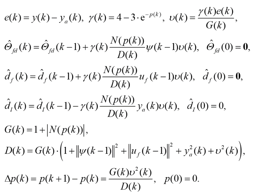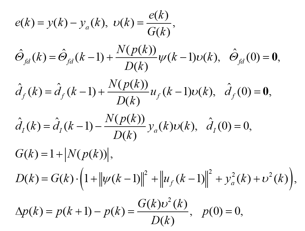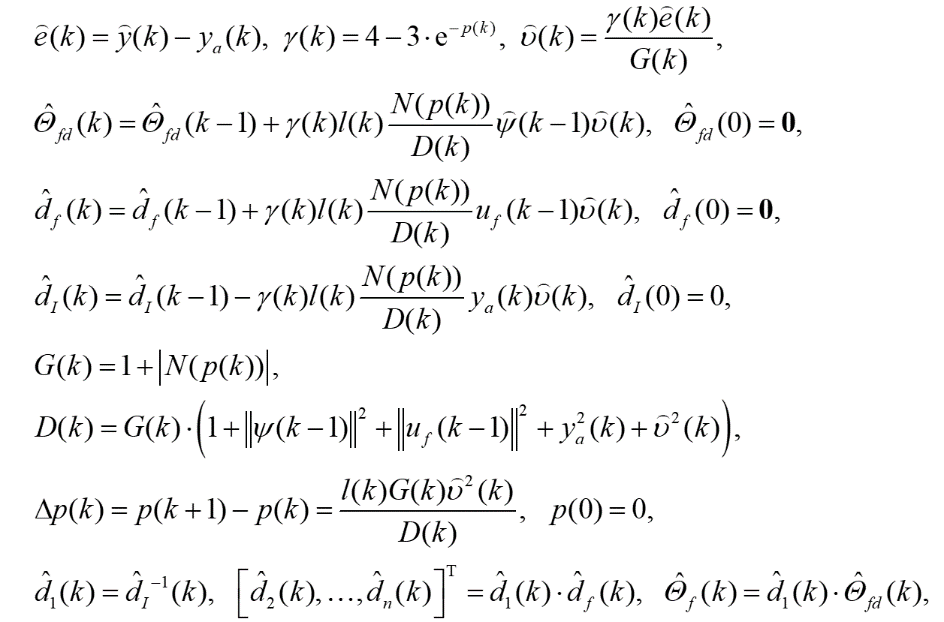 必須修改遞歸參數更新律(6)。使用參考文獻中的死區方法,使用項l(k)來設置更新過程的閾值。因此,利用濾波后的輸出,參數更新規律如下: