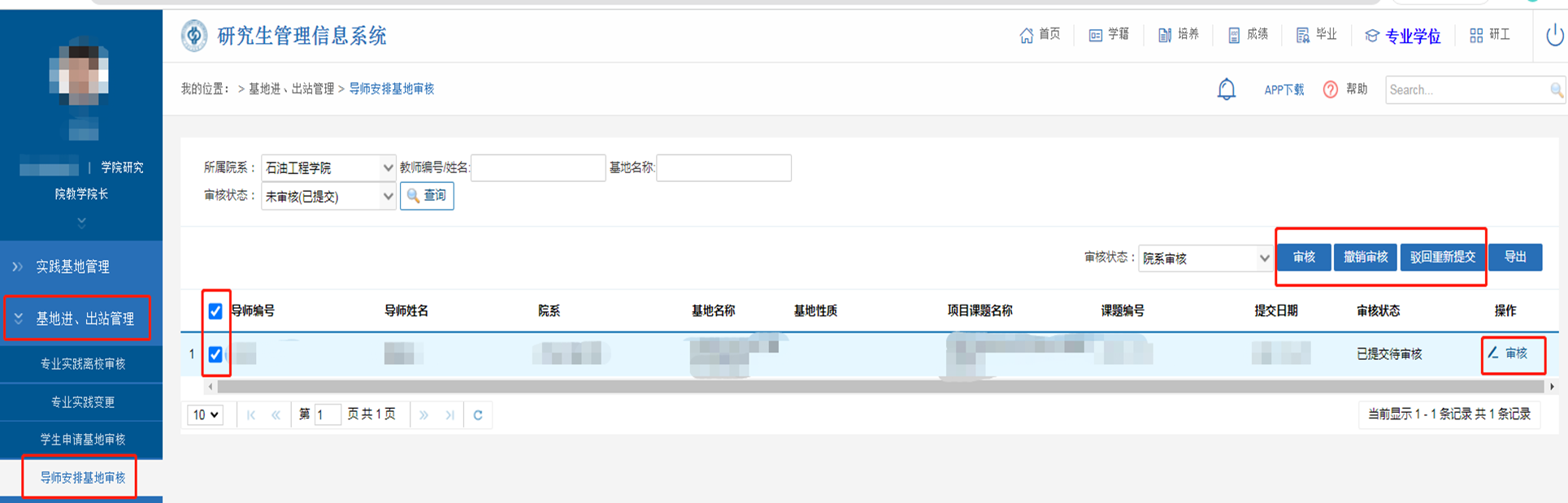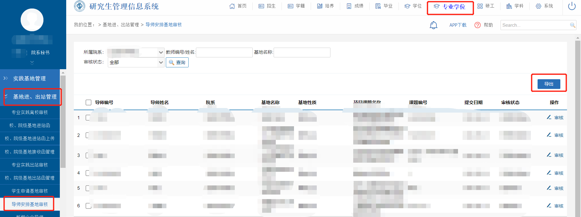 在【專業學位】-【基地進、出站管理】-【導師安排基地審核】中,查看、導出信息。