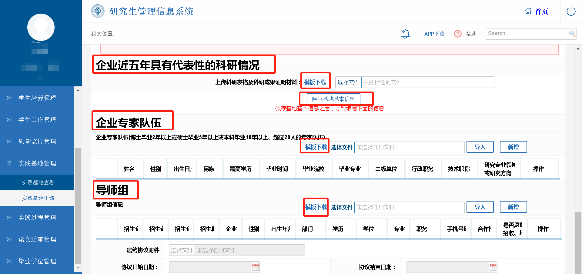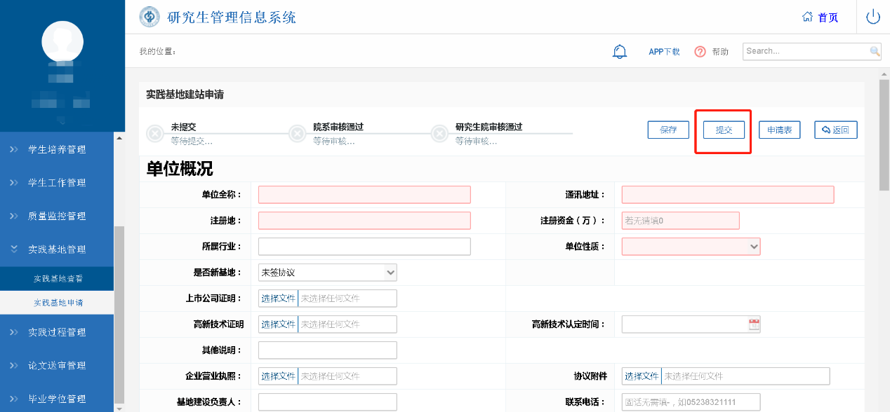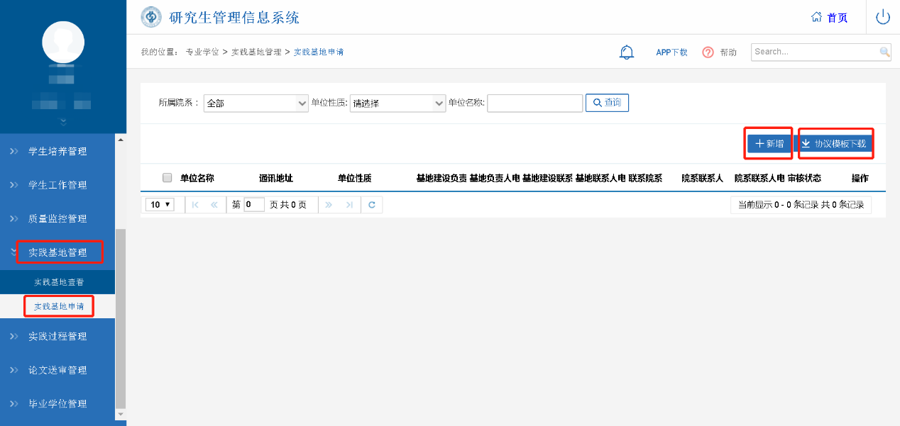 教師登錄研究生管理信息系統,選擇實踐基地管理,實踐基地申請,點擊新增。