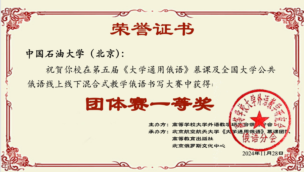喜報(bào):中石大在全國(guó)大學(xué)俄語(yǔ)書(shū)寫(xiě)大賽中榮獲團(tuán)體賽一等獎(jiǎng)