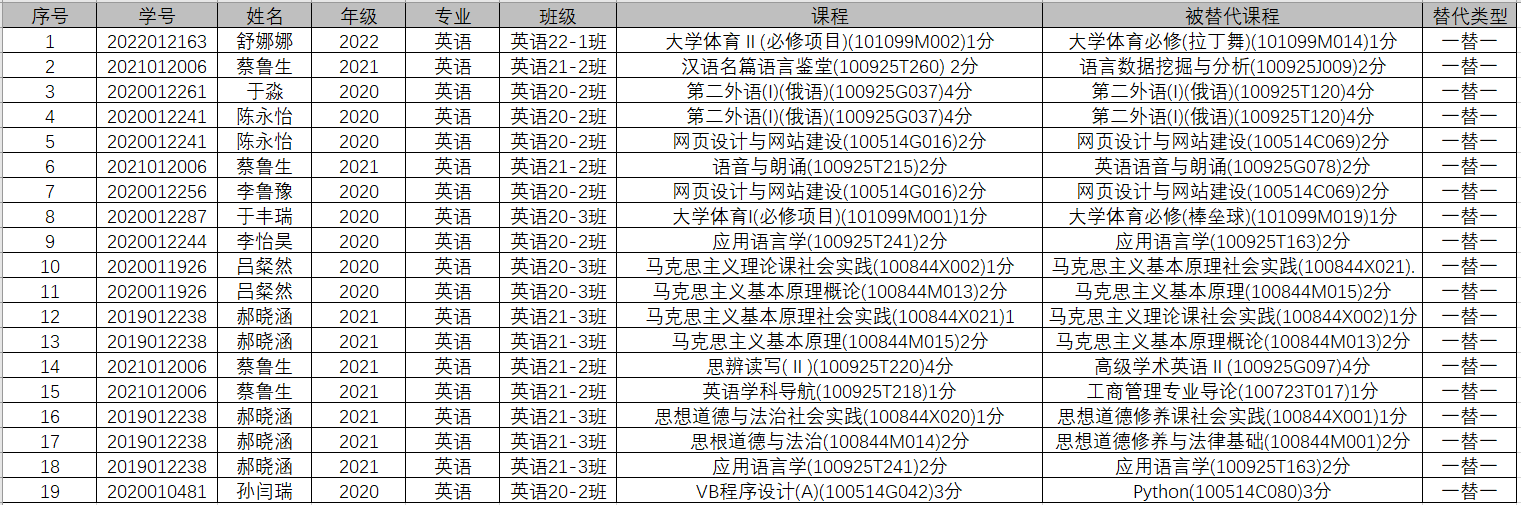 根據(jù)教務(wù)處通知要求,現(xiàn)對(duì)本科生申請(qǐng)辦理課程替代情況公示如下: