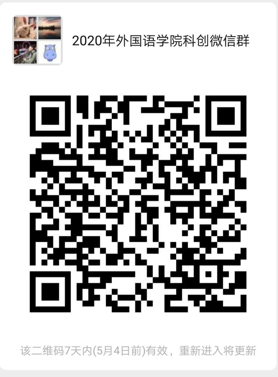 請所有申報(bào)項(xiàng)目的同學(xué)加入2020年外國語學(xué)院科創(chuàng)微信群,如有疑問請?jiān)谌豪镒稍?/span>。