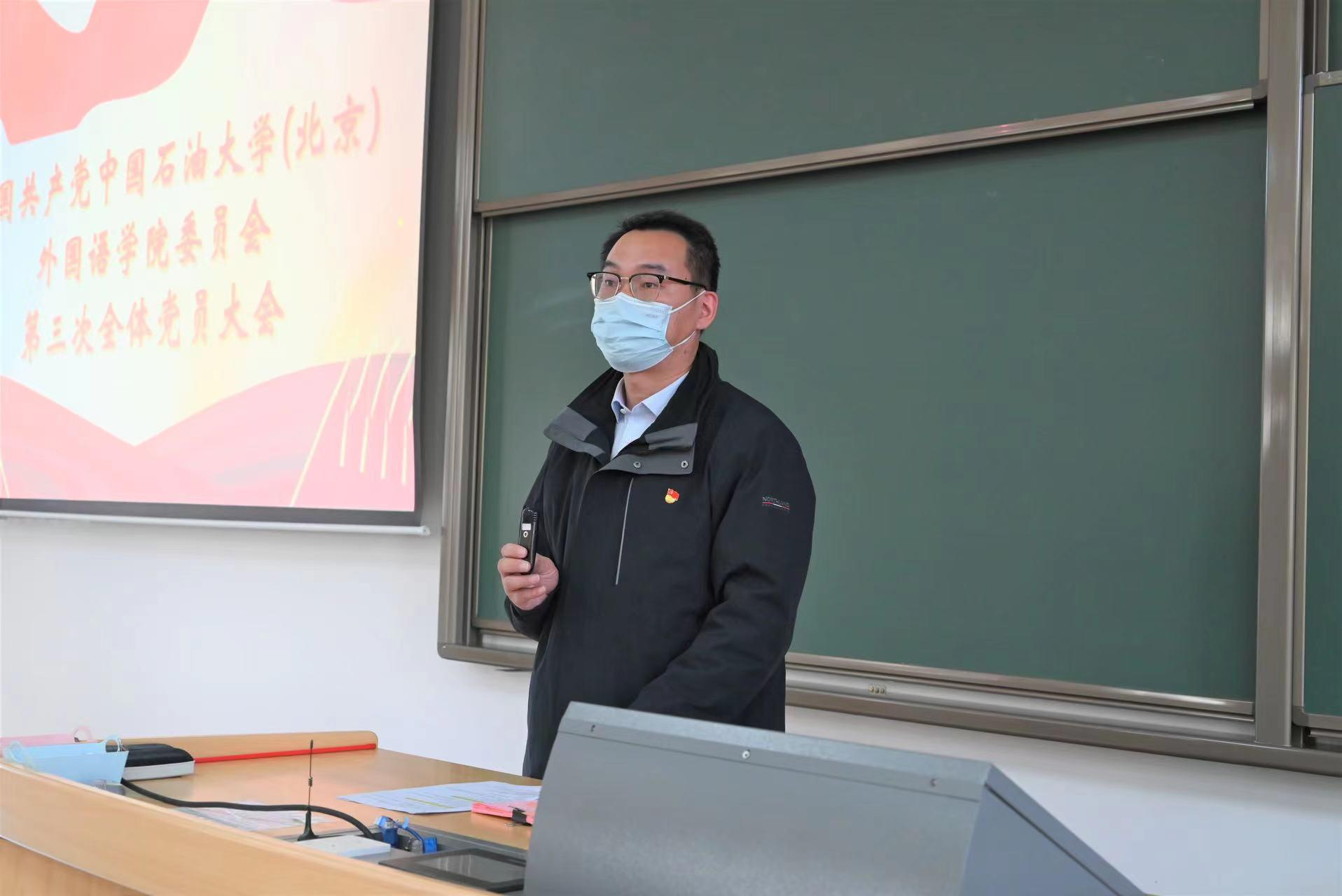 11月3日,中國共產黨中國石油大學(北京)外國語學院第三次全體黨員大會在第五教學樓202教室順利召開。校黨委副書記、紀委書記韓克飛、學院全體師生黨員參加了會議,院長趙秀鳳、心理健康教育及咨詢中心主任鄧聽、副院長崔亞霄、英語系副主任陳冰飛應邀列席會議。會議由學院黨委副書記劉春陽主持。會議主要任務是聽取和審議上屆黨委工作報告,選舉新一屆委員會。