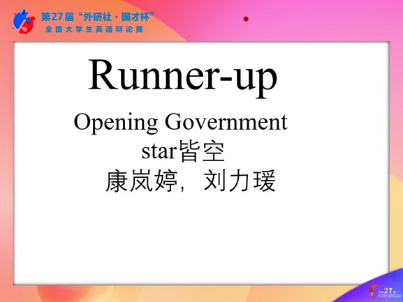外國語學院2022級本科生孫瑞汐、陳曉璐獲校選賽冠軍,并獲“最佳辯手”稱號與華北地區復賽資格。外國語學院2022級本科生康嵐婷、劉力瑗獲校選賽亞軍,外國語學院2022級本科生張子怡、孟潤妍,以及2022級本科生趙陽、楊越獲校選賽季軍。
