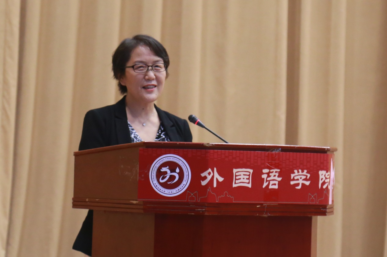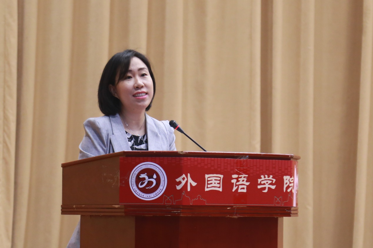外國語學院院長趙秀鳳教授致辭。趙院長首先對2020級新生表示熱烈歡迎。趙院長表示,疫情之下,這屆新生遭遇了前所未有的嚴峻考驗,但眾多抗議過程中涌現的英雄始終鞭策著、激勵著同學們勇往直前。與此同時,趙院長對這屆已經經歷過風雨的大一新生充滿信心并給予充分的肯定。深處百年未有之大變局時代,國家面臨前所未有的挑戰,因此趙院長對新一代青年人寄予厚望,鼓勵同學們突破“小我”,構筑“大我”,為祖國助力。此外,趙院長對作為中外語言建設的青年人提出要求:既要有世界視野,又要有家國情懷;用語言作為武器去打拼在國際戰場;用語言在國家和世界之間搭建橋梁;用語言講述中國故事,傳播中國文化;用語言傳播智慧,成就夢想。最后,趙院長鼓勵同學們大學里的每一天,都要用堅定的信念,用實際的行動,汲取力量,成就夢想,報效國家。