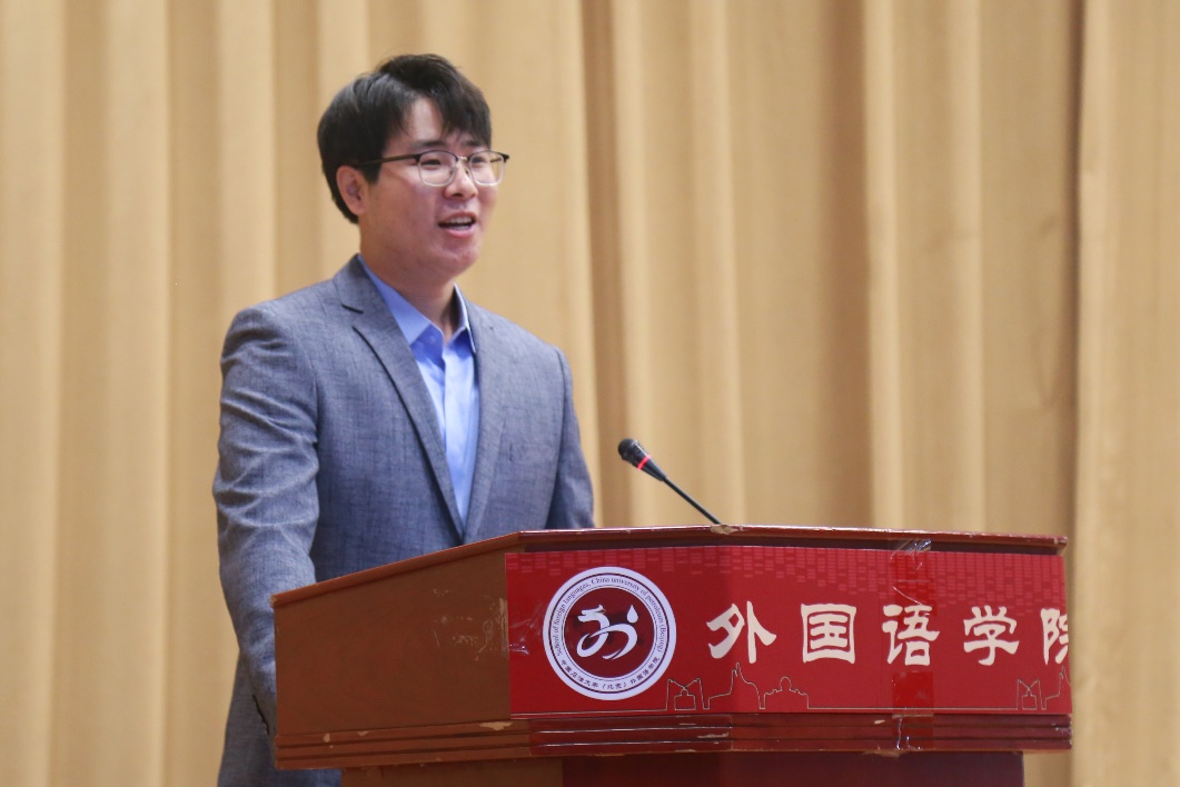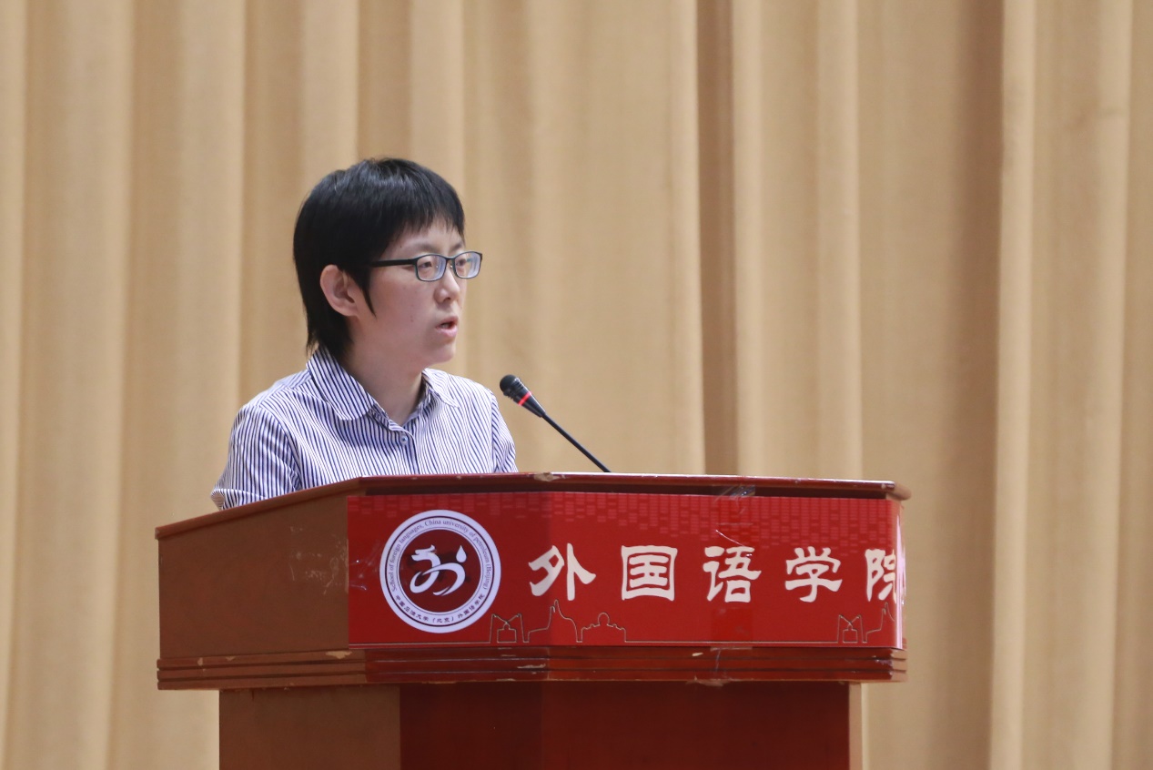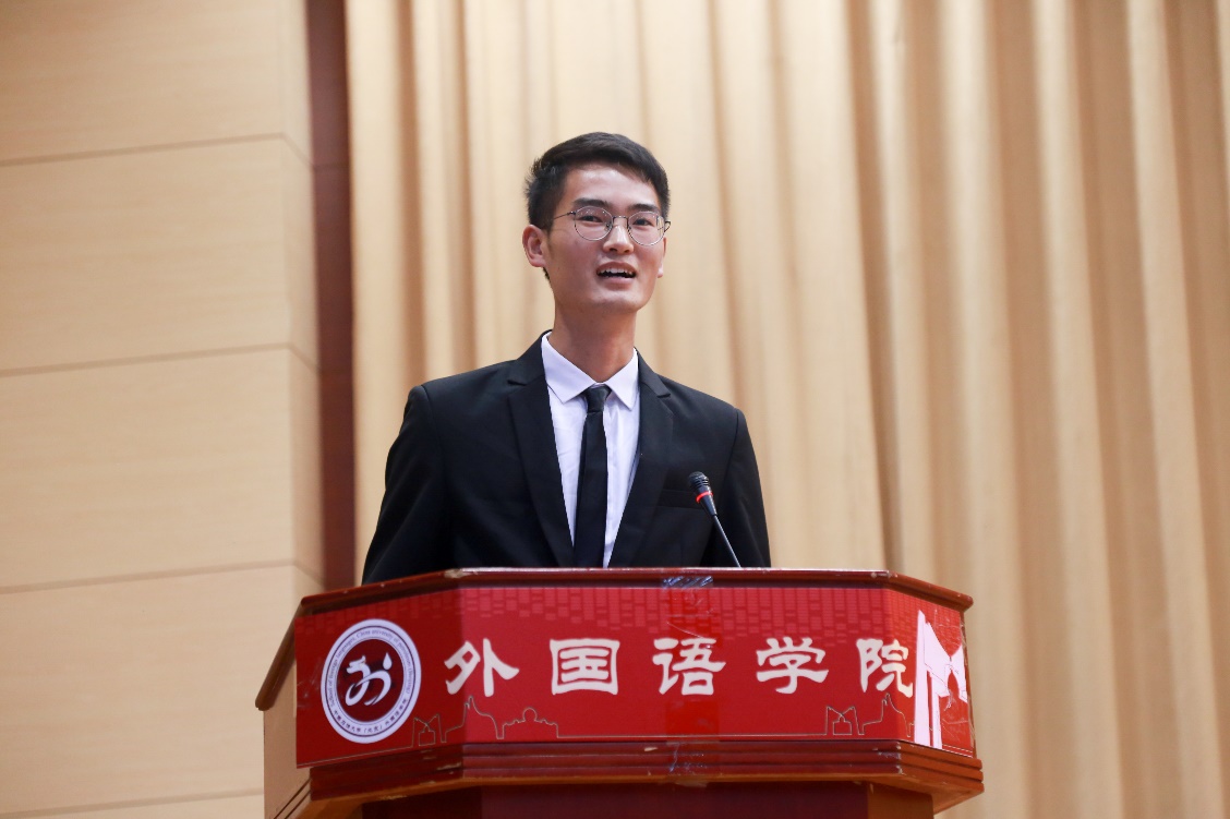 研究生新生代表2020級碩士研究生楊哲同學發言。楊哲同學感慨本科四年外國語學院對他的巨大幫助,今后作為一名研究生會更加以嚴格的標準要求自己,以實際行動報答學院老師的辛勤栽培,為學院貢獻自己的力量。最后,在外國語學院20歲生日之際,楊哲同學向學院表達了美好的祝愿。