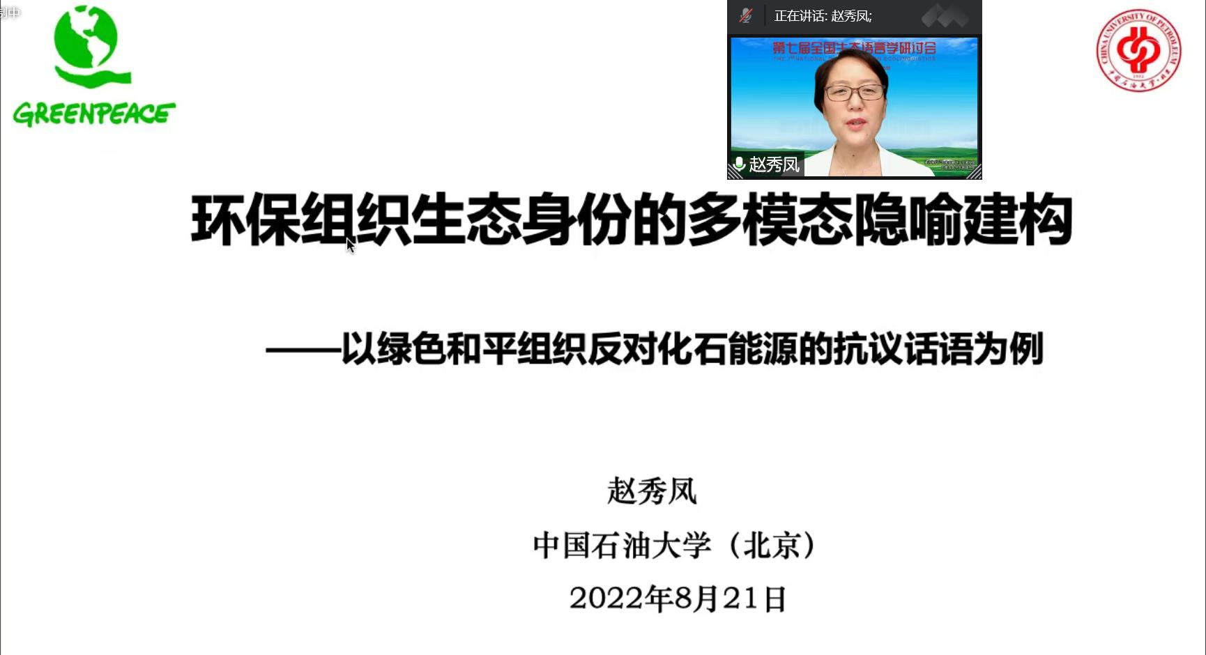 趙秀鳳教授作為主旨發(fā)言專家,作了題為“環(huán)保組織生態(tài)身份的多模態(tài)隱喻建構(gòu)——以綠色和平組織反對化石能源的抗議話語為例”的報(bào)告,從多模態(tài)隱喻的視角探討了國際環(huán)保組織的生態(tài)身份建構(gòu)問題,通過展示豐富的圖文語料,生動(dòng)地闡明了綠色和平組織在多模態(tài)抗議話語中建構(gòu)的多重生態(tài)身份。該項(xiàng)研究體現(xiàn)了能源話語研究的生態(tài)語言學(xué)視角,為推動(dòng)我院的特色研究——能源話語研究開拓了理論視野。