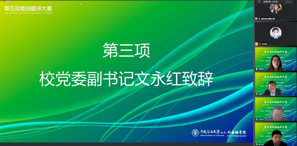 2022年12月29日,第五屆能源翻譯大賽決賽在中國石油大學(北京)以線上形式舉行。大賽邀請北京航空航天大學外國語學院文軍教授,上海電力大學外國語學院院長潘衛民,哈爾濱工業大學外國語學院副教授、翻譯教學與研究中心主任鄭淑明,南京林業大學教授肖飛,東北石油大學外國語學院副院長、副教授喬洪亮,中國石油大學(北京)外國語學院副院長徐方富擔任評委。中石大黨委副書記文永紅、外國語學院院長趙秀鳳參加閉幕式并致辭。