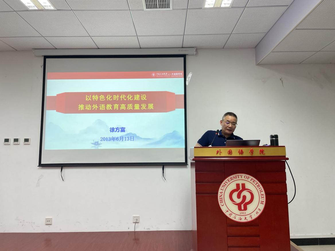 鄭世高以“理解當(dāng)代中國 推進(jìn)‘三進(jìn)’工作;矢志能源報國 培養(yǎng)‘三有’人才”為題,從第二次鴉片戰(zhàn)爭中“port”一詞的理解和翻譯引入話題,全面總結(jié)了外國語學(xué)院在推動“三進(jìn)”工作和培養(yǎng)“三有”人才方面形成的特色、路徑,以及取得的成績。