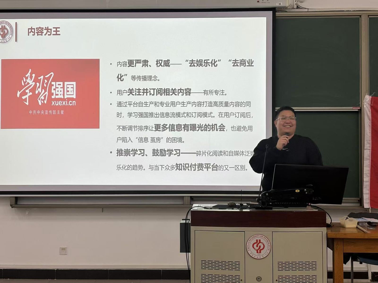 葉鵬以《融媒體時(shí)代文化創(chuàng)新傳播中的文化自信》為主題,圍繞文化自信在傳統(tǒng)文化、網(wǎng)絡(luò)文化、紅色文化中的創(chuàng)新傳播展開講解,結(jié)合文化類原創(chuàng)綜藝欄目、中華文化主題宣傳片、黨史動(dòng)漫專題片等視頻,激勵(lì)青年們深入學(xué)習(xí)了解黨史和中華優(yōu)秀傳統(tǒng)文化,堅(jiān)定文化自信,傳承紅色基因,為實(shí)現(xiàn)中華民族偉大復(fù)興的中國夢貢獻(xiàn)青春力量。
