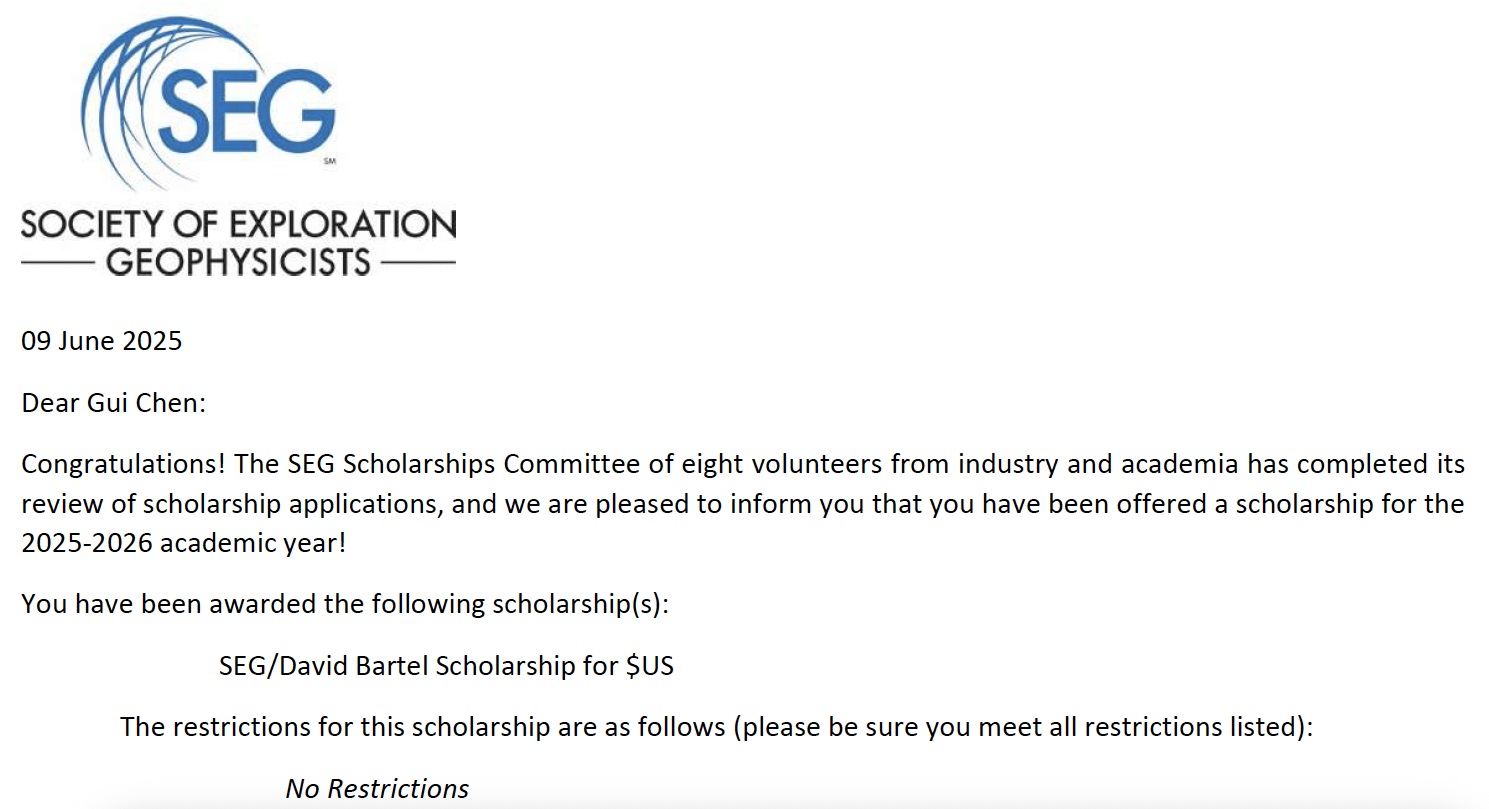 SEG獎學金由國際勘探地球物理學家學會(Society of Exploration Geophysicists)設立,旨在表彰全球范圍內致力于地球物理及相關領域科學研究,并取得突出學術成果的優秀學生。SEG獎學金每年面向全球開放申請,評選過程極為嚴格,需通過學術成績、科研成果、專業素養、專業能力、SEG參與情況以及SEG志愿服務等多個維度的綜合評審。據SEG官網數據顯示,上一年度,全球共有375名學生申請SEG獎學金,最終66人獲得獎學金資助,中國僅3名學生獲得資助。