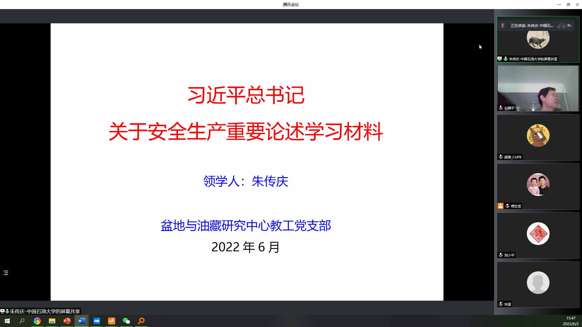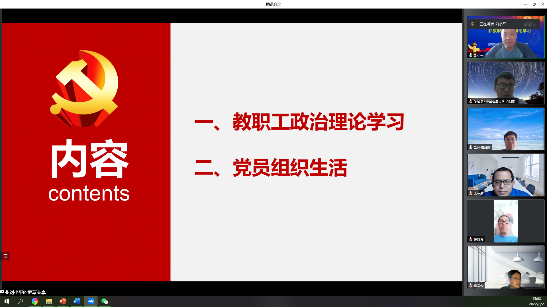 2022年6月2日下午,盆地與油藏研究中心教工黨支部組織全體教職工線上進行了“黨支部組織生活和教職工政治理論學習”,共有38名黨員和教職工參加了本次組織生活會,會議由劉小平同志主持,會議分為兩個階段。