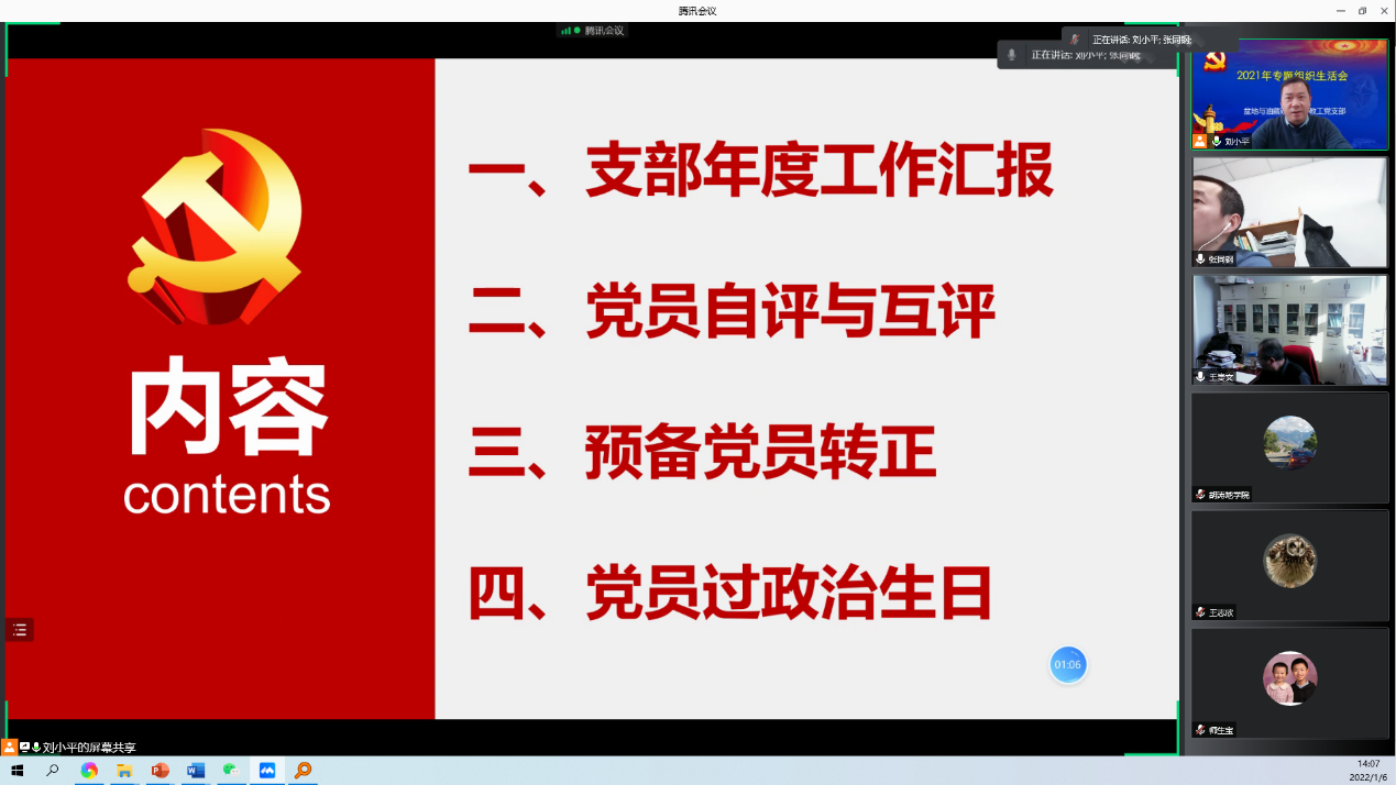 2022年1月6日下午,盆地與油藏研究中心教工黨支部組織全體教職工線上進行了“2021年專題組織生活會”,共有32位黨員和教職工參加了本次組織生活會,會議由劉小平同志主持,學院黨委書記王貴文同志、學院副院長劉鈺銘同志參加了會議,會議分為四個階段。