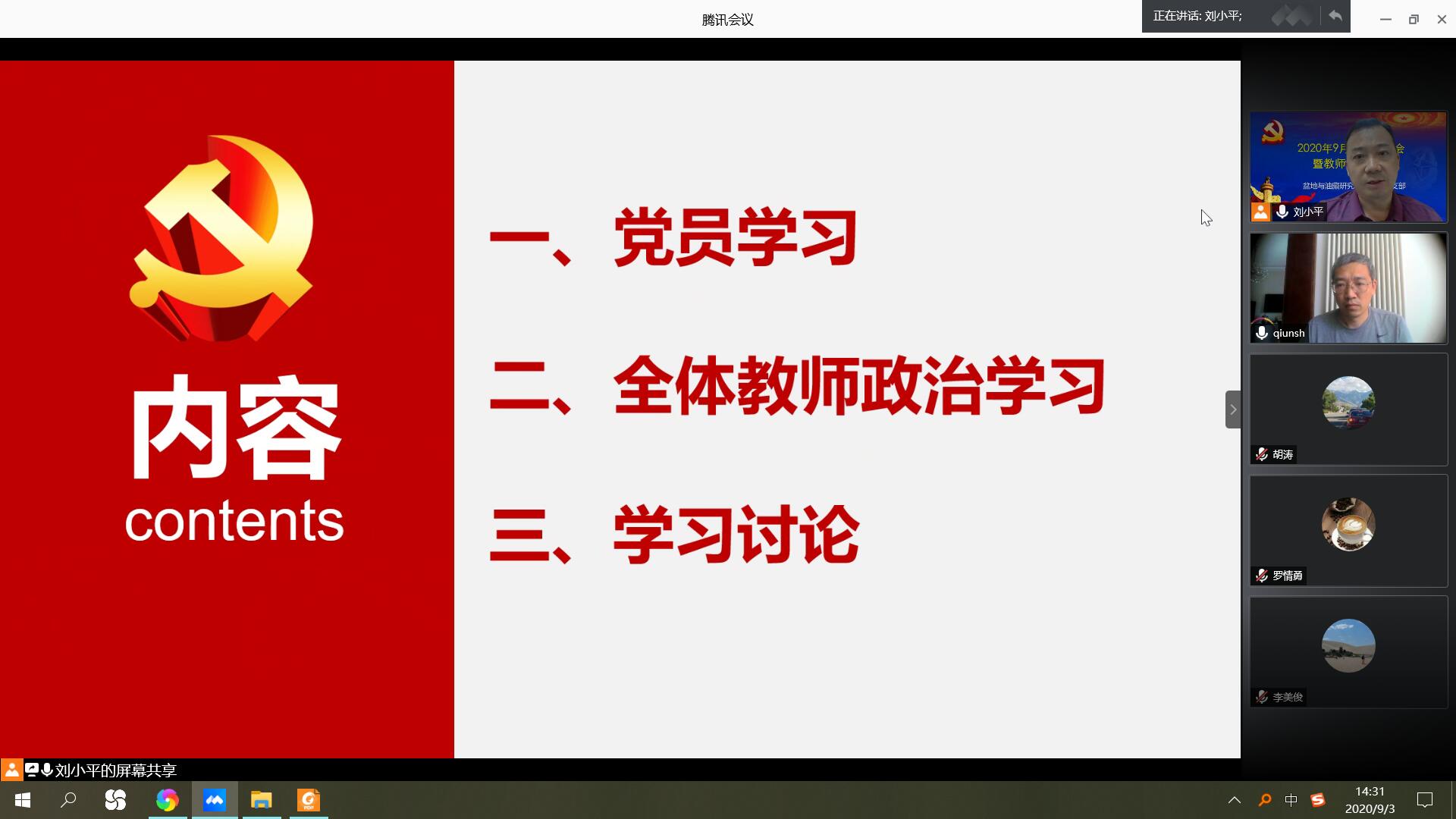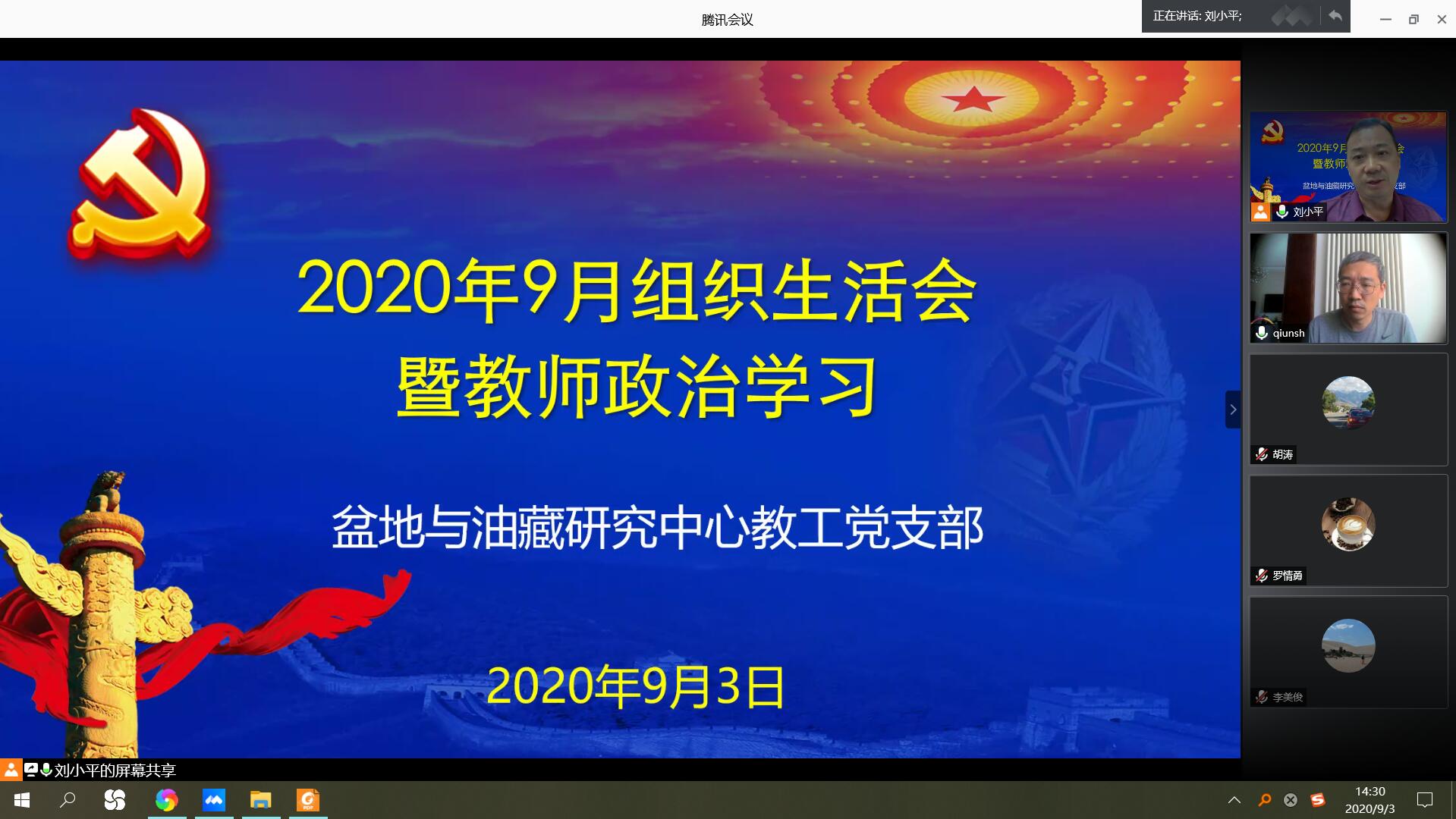 9月3日下午,遵照校黨委統(tǒng)一部署,地球科學(xué)學(xué)院盆地與油藏研究中心教工黨支部組織召開(kāi)黨員組織生活暨全體教師政治學(xué)習(xí)討論會(huì),就“習(xí)近平總書(shū)記關(guān)于‘四史’及新冠肺炎疫情防控的重要論述”、“《中國(guó)共產(chǎn)黨的九十年》、《簡(jiǎn)明中國(guó)歷史讀本》以及《抗擊新冠肺炎疫情的中國(guó)行動(dòng)》等著作和資料”以及“師德師風(fēng)建設(shè)”開(kāi)展線上學(xué)習(xí)與討論,會(huì)議由黨支部書(shū)記劉小平主持。