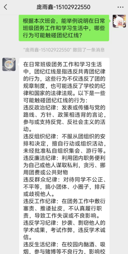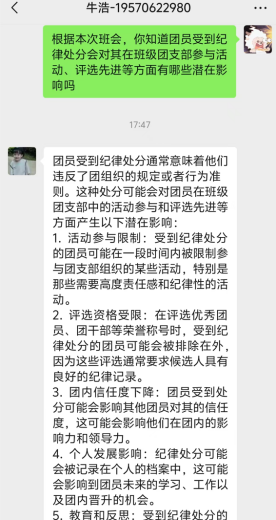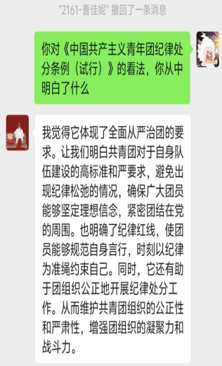 地研24-6團支部通過團紀知識學習、案例分析、分組討論、互動問答、總結發言開展學習地研24-1團支部組織骨干成員全面梳理《中國共產主義青年團紀律處分條例》條款,收集團紀處分典型案例(如因違反組織紀律、工作紀律等受到處分的實際團內事件)、相關政策解讀文章以及團史中紀律建設重要事件資料在班級廣泛宣傳。地研24-3團支部通過自學和集中學習相結合的方式,對條例進行了深入學習。將同學們分成小組進行討論,分享學習心得,探討如何在實際行動中落實團紀要求。