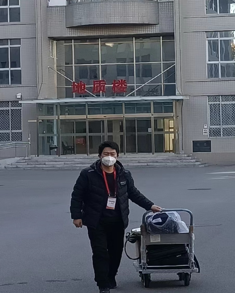 ===堅守在地質樓的老師與志愿者老師配合,不斷地為隔離在外老師和學生們傳送著電腦等設備===