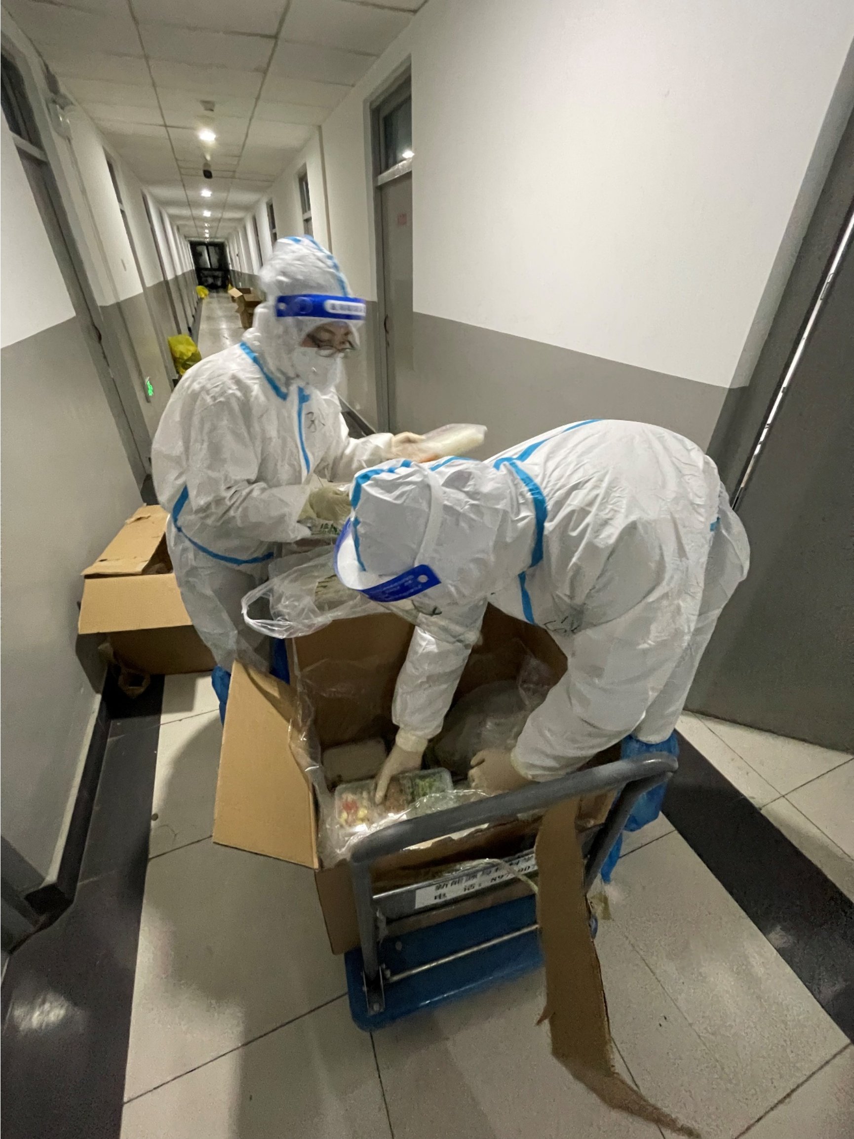 ===突擊隊員們不停地忙碌,無論白日還是黑夜,把一份份溫暖送到隔離學生手中===
