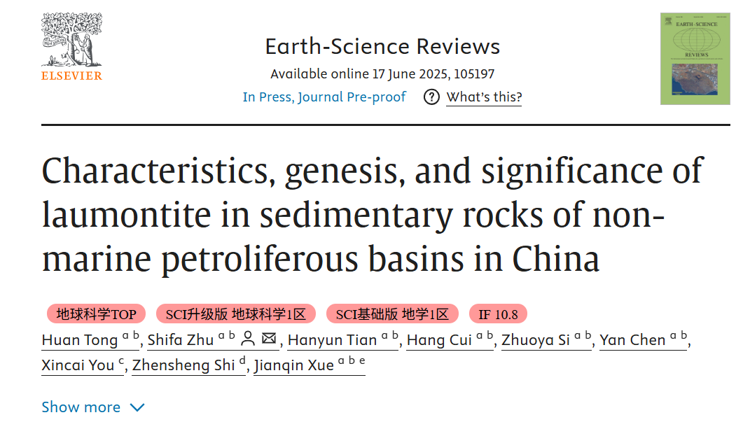 該研究成果《Characteristics, genesis, and significance of laumontite in sedimentary rocks of non-marine petroliferous basins in China》發表在地學著名期刊《Earth-Science Reviews》上。論文通訊作者為朱世發教授,第一作者為我院2023級博士研究生佟歡,中國石油大學(北京)油氣資源與工程全國重點實驗室和地球科學學院為第一完成單位。