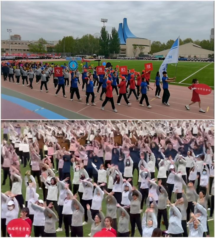 開幕式上,學院代表隊著裝整齊,喊著嘹亮的體育精神口號,展現出地學人積極進取、昂揚向上的精神面貌。在第九套廣播操表演環節,教職工們伴隨輕快的節奏,動作整齊劃一,洋溢著青春活力。