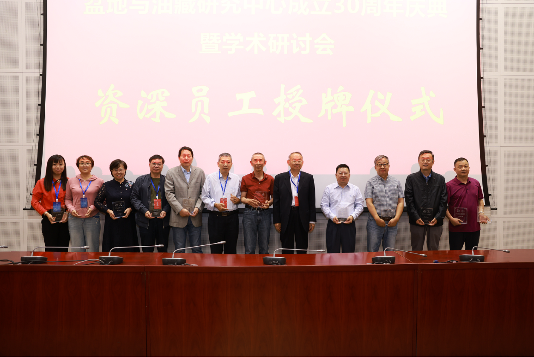 金之鈞為在盆地中心工作10、20和30周年的員工進行了授牌儀式,金衍為金之鈞舉行了盆地中心終身榮譽主任授牌儀式,最后與會代表進行了合影留念。