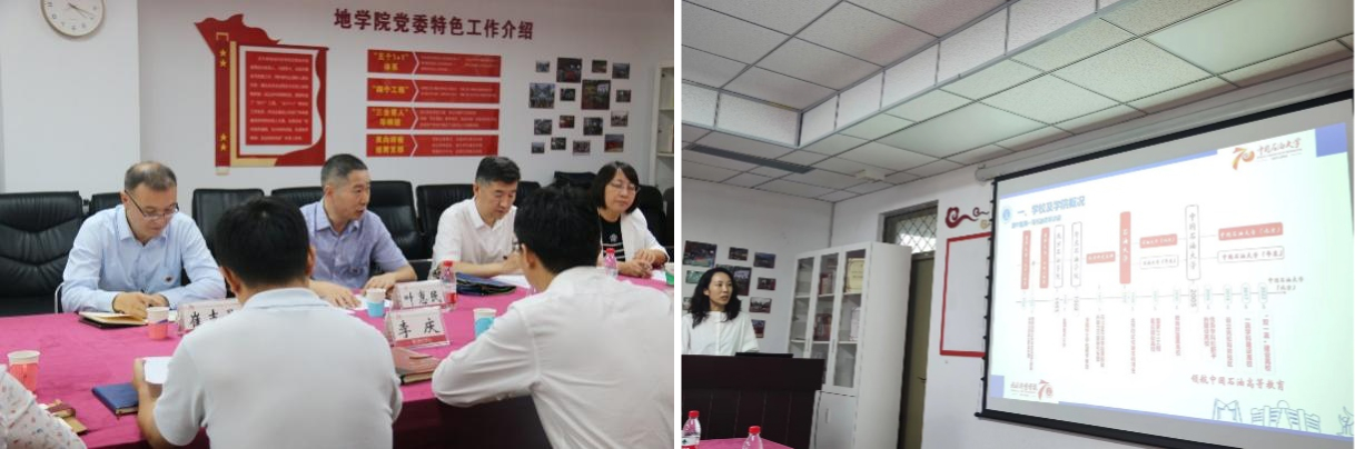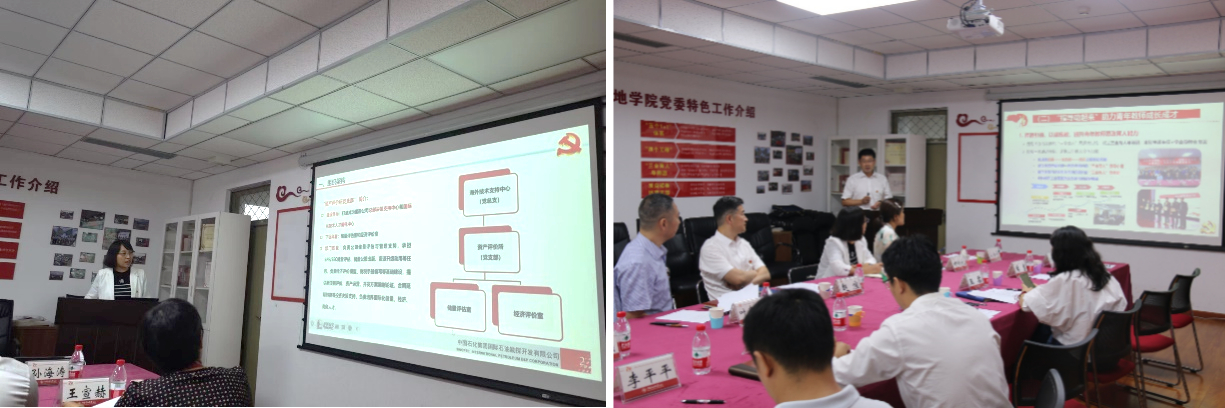 海外技術支持中心的資產評價所黨支部書記那未紅從支部組織架構、人員構成、部門職能、國際交流合作、黨建工作及獲得榮譽詳細介紹了資源評價所支部情況。油氣勘探與開發地質系教工黨支部書記周勇以“堅守立德樹人初心、勇擔能源報國使命”為主題,介紹了支部情況,并提出了共建計劃和預期成果——“培育優秀黨建成果、建立完善合作育人機制、探索建立校企產學研合作模式、形成推廣示范效應”。