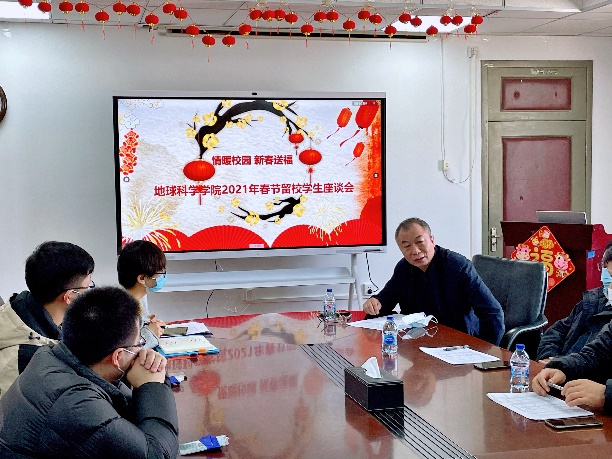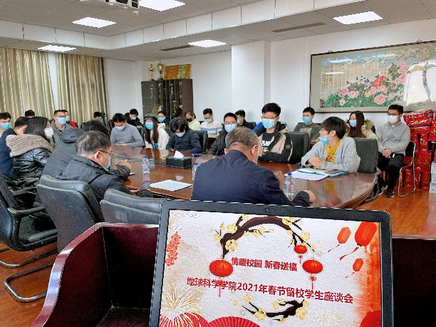因疫情防控和論文實驗等原因,2021年春節(jié),我院有35名同學(xué)無法返鄉(xiāng),留在學(xué)校過年。為充分了解留校學(xué)生學(xué)習(xí)生活情況,同時送上學(xué)院的新春祝福,2月9日上午,學(xué)院在地質(zhì)樓1105舉辦“情暖校園 春節(jié)送福”2021年春節(jié)留校學(xué)生座談會暨新春慰問活動,學(xué)院領(lǐng)導(dǎo)班子全體成員,輔導(dǎo)員及所有留校學(xué)生參加了活動。