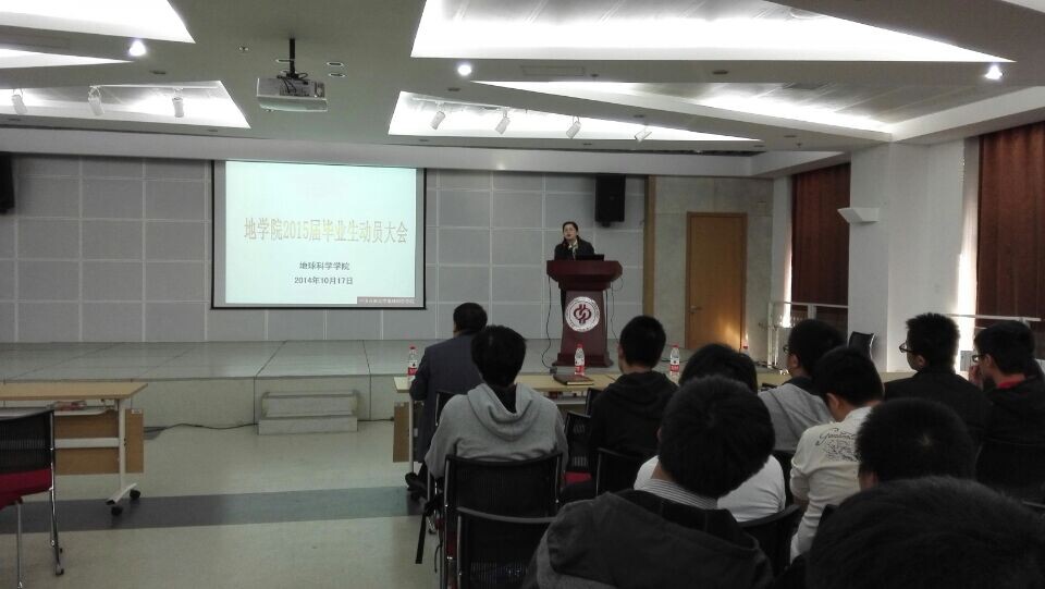 2014年10月17日下午2:30-4:00,地學院于校活動中心就業報告廳召開2015屆畢業生就業動員大會。我校就業指導處長岳長濤老師、地學院黨委副書記陳冬霞老師以及2015屆全體畢業生參與了此次會議。