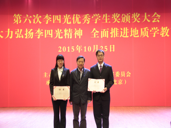 “第六次李四光優秀學生獎”共表彰了18位求學期間在地質類專業領域上突出的學生,國土資源部部長姜大明為他們頒獎并親切交談。我校地學院12級碩士生張佳佳和12級本科生張毅穎分別獲得“李四光優秀碩士研究生獎”和“李四光優秀大學生獎”。張佳佳專業基礎扎實,勤于思考,勇于創新,目前已發表學術論文7篇,其中國內SCI1篇,以第一作者發表國際三區SCI論文一篇,同時以第一作者發表兩篇國際重要會議論文。張毅穎學習成績優異,是北京市三好學生和“先鋒杯”優秀團員,本科三年,共獲得5項國家級獎勵,4項省部級獎勵,10項校級獎勵,以第一作者發表兩篇學術論文。