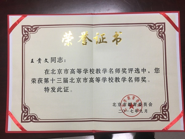 根據(jù)市教委《關(guān)于開展第十三屆北京市高等學(xué)校教學(xué)名師獎(jiǎng)暨首屆北京市高等學(xué)校青年教學(xué)名師獎(jiǎng)評(píng)選工作的通知》(京教高〔2017〕9號(hào)),經(jīng)學(xué)校推薦、現(xiàn)場(chǎng)教學(xué)觀摩課評(píng)價(jià)、評(píng)審專家組評(píng)議、評(píng)審委員會(huì)投票、市教委審核并公示,授予82名教師第十三屆北京市高等學(xué)校教學(xué)名師獎(jiǎng),我院王貴文教授榮獲此殊榮。