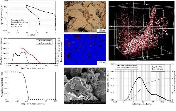 綜合表征致密砂巖儲層中發育的不同類型和不同尺度大小的孔喉組合特征是油氣儲層研究前沿和熱點領域,該研究在闡明孔隙結構影響地質因素的基礎上,綜合研究了基于鑄體薄片、掃描電鏡、壓汞曲線、核磁共振、氮氣吸附和CT掃描的孔喉表征方法,并引入分形維數的方法來實現孔喉特征精細表征。在不同尺度大小孔喉體系特征表征、孔喉微觀特征與宏觀物性聯系、二維及三維孔喉特征綜合評價等方面提出了創新性認識。
