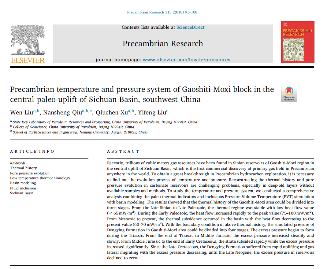 近日,我院邱楠生教授研究團隊在沉積盆地古老海相碳酸鹽巖地層溫壓場研究方面取得重要進展。研究成果《Precambrian temperature and pressure system of Gaoshiti-Moxi block in the central paleo-uplift of Sichuan Basin, Southwest China》發表在地學著名期刊《Precambrian Research》上。論文通訊作者為邱楠生教授,第一作者為我院2014級博士研究生劉雯,其余作者徐秋晨、劉一鋒均為邱楠生教授團隊博士生,中國石油大學(北京)油氣資源與探測國家重點實驗室和地球科學學院為第一完成單位。《Precambrian Research》是地球科學領域的一區TOP期刊,擁有較強的學術影響力,期刊重點出版地球和臨近行星早期組成、結構以及演化相關的前沿科學報道,近5年平均影響因子為4.657。