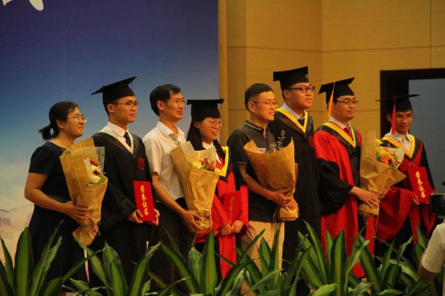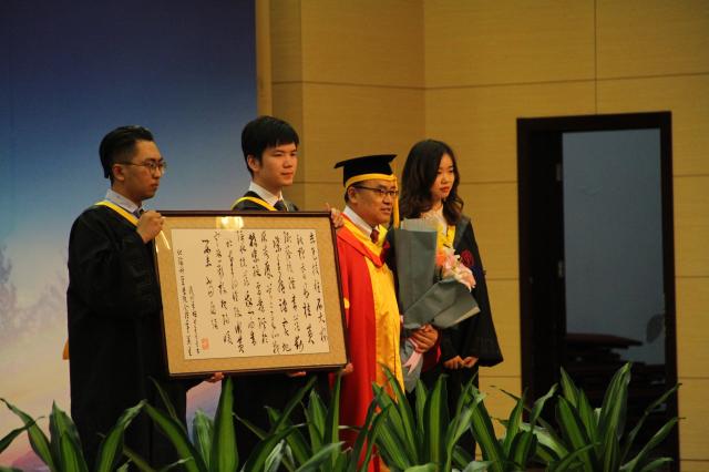 儀式前,播放了本學院畢業生校園生活視頻,回放了畢業生在石大學習、生活的難忘場景,畫面溫馨感人。隨后,畢業生代表演唱了歌曲《送別》和《勘探隊員之歌》。學位授予儀式上,地球科學學院曾濺輝院長介紹到場嘉賓、宣布授予儀式開始,學院黨委書記王貴文為畢業生代表贈送紀念品,畢業生導師為第一屆論文致謝大賽獲獎同學頒獎,學位委員會副主任岳大力宣讀學位授予決定,畢業生代表向校長張來斌贈送了學生書寫的詩詞書法作品《江城子·七色》。