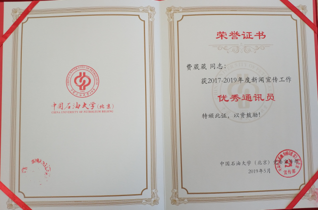 學(xué)院獲評(píng)2017—2019年度新聞宣傳工作先進(jìn)單位榮譽(yù)稱號(hào),“地心引力CUP”微信公眾號(hào)獲評(píng)2017—2019年度優(yōu)秀微信公眾號(hào),費(fèi)葳葳獲2017—2019年度新聞宣傳工作優(yōu)秀通訊員榮譽(yù)稱號(hào)。