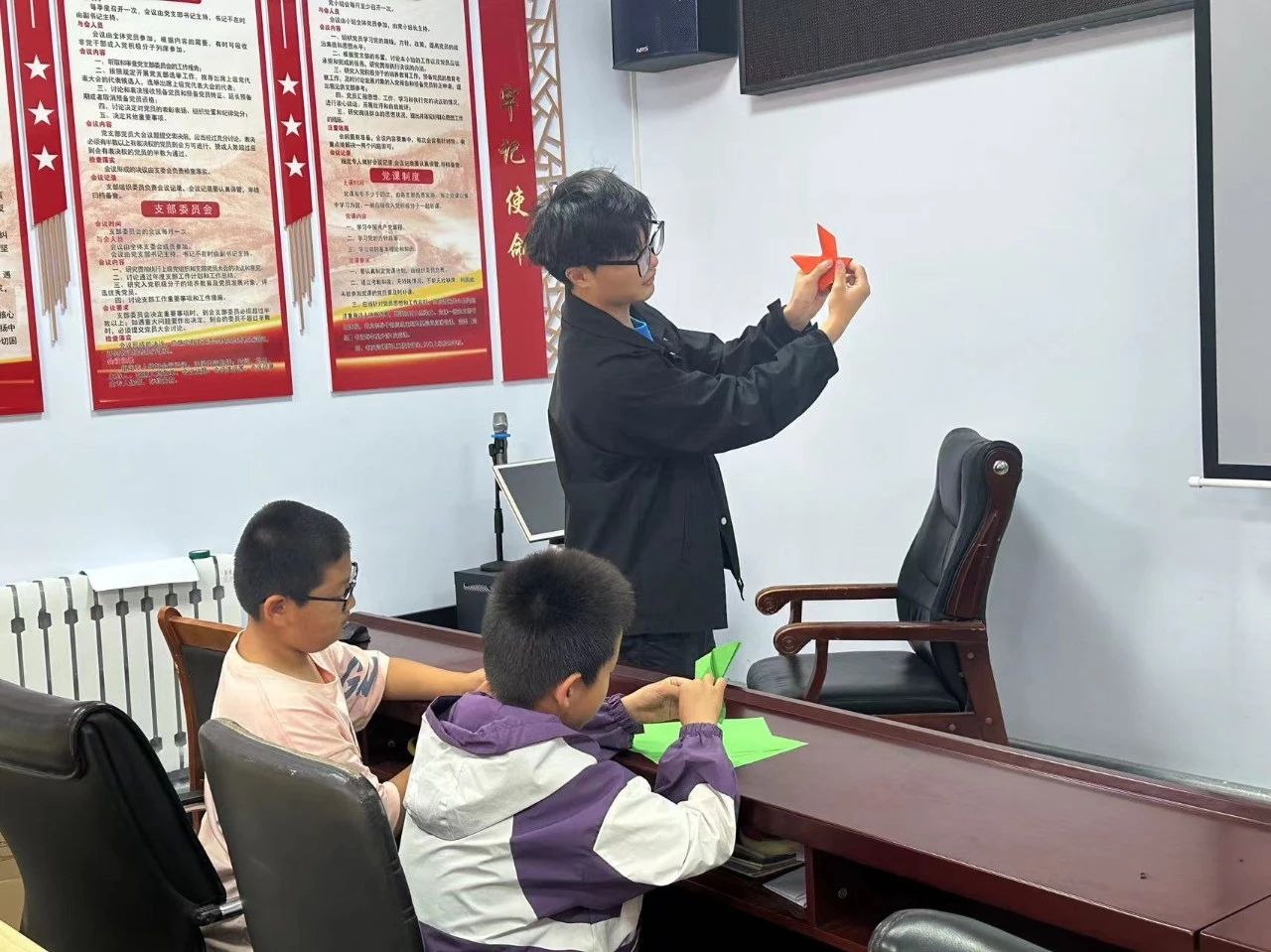大手牽小手,折出精彩篇章。實踐團成員許翔開展了“折紙動手,豐富生活”的課堂。先通過對折紙歷史和發展的講解,讓小朋友深入了解了折紙的起源。 小小紙張,能力不小,翻動翻動,驚喜出現,通過一步步講解帶領小朋友們學會了折鴿子以及千紙鶴,豐富了動手能力,同時在日常生活中也會減少電子產品的使用。