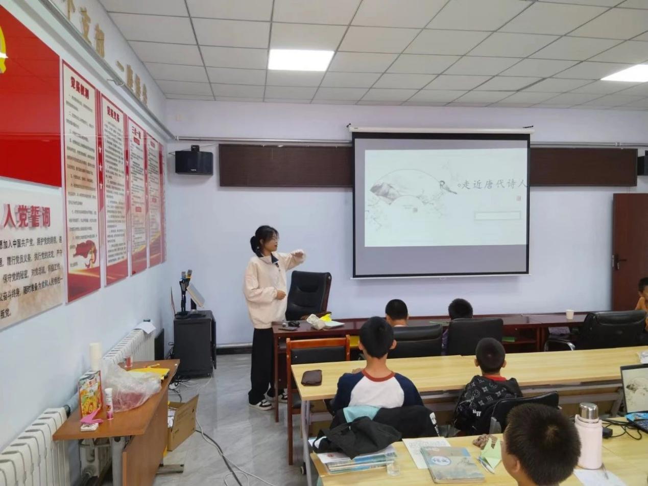 誦讀經典唐詩,領略傳統文化之美。實踐團成員胡婉婷帶領小朋友們穿越歷史的大門,探索了古代的盛世唐朝。在實踐團成員的講解下,灑脫自由的李白、生不逢時的杜甫、剛正不阿卻屢屢被貶的白居易、再無知音相遇的李商隱等著名詩人向小朋友們緩緩走來,使學生們深入了解詩人的愛恨情仇,生平事跡。趣味語文課程的開展不僅弘揚了國學經典,更加激發了小朋友們對于國學經典的興趣!