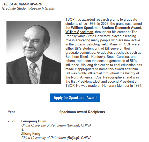 Spackman Award由TSOP于1999年設立,2005年為紀念著名煤巖學家、賓夕法尼亞州立大學教授William Spackman更名為Spackman Award,旨在全球范圍內資助博士生及研究生開展有機巖石學前沿研究,涵蓋干酪根巖石學、煤巖學、油氣地球化學等領域。該獎項每年評選兩名獲獎者,資助其開展科學研究或參與學術會議。