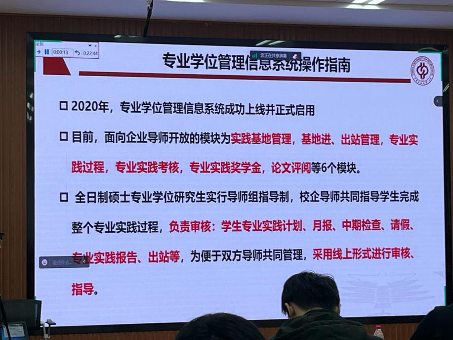 第二部分是由學(xué)院組織的培訓(xùn)會議。會議由分管研究生教學(xué)院長牛花朋主持,圍繞學(xué)院概況、研究生專業(yè)設(shè)置、2022級專業(yè)型碩士研究生派遣情況和培養(yǎng)管理等進行了介紹,并進一步強調(diào)企業(yè)導(dǎo)師在專業(yè)型碩士培養(yǎng)和管理過程中的重要性,同時感謝各位導(dǎo)師對學(xué)生的傾心付出、對學(xué)校學(xué)院專業(yè)學(xué)位工作的大力支持。最后,還帶領(lǐng)企業(yè)導(dǎo)師共同學(xué)習(xí)和熟悉了研究生系統(tǒng)的操作方法。